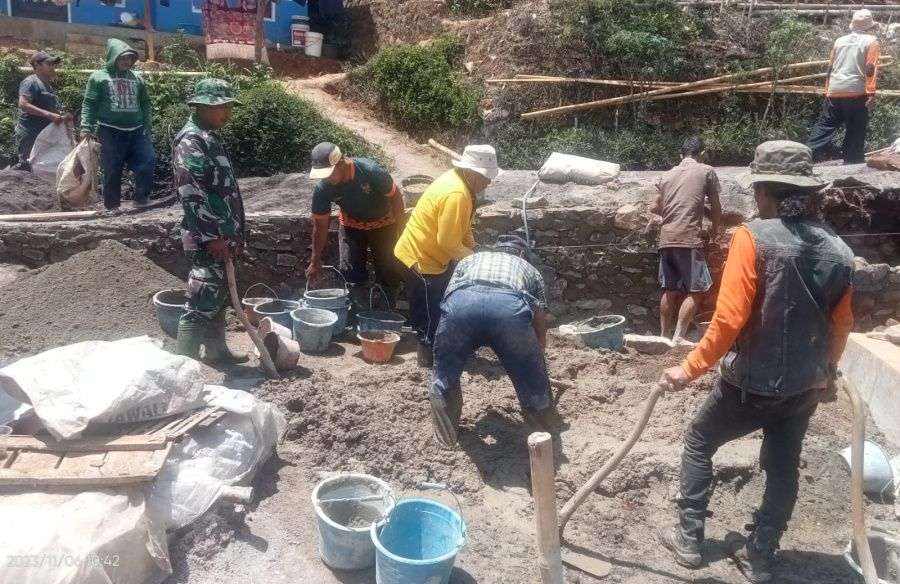 Kan. Bandung, Parahiangannews- Serda Asep Riki Babinsa Koramil 2416/Pacet melaksanakan kegiatan karya bakti (karbak) pengecoran jalan bersama warga masyarakat di Kampung Sayuran RT 02 RW 08 Desa Girimulya kecamatan Pacet Kabupaten Bandung, Kamis(19/3/2026).